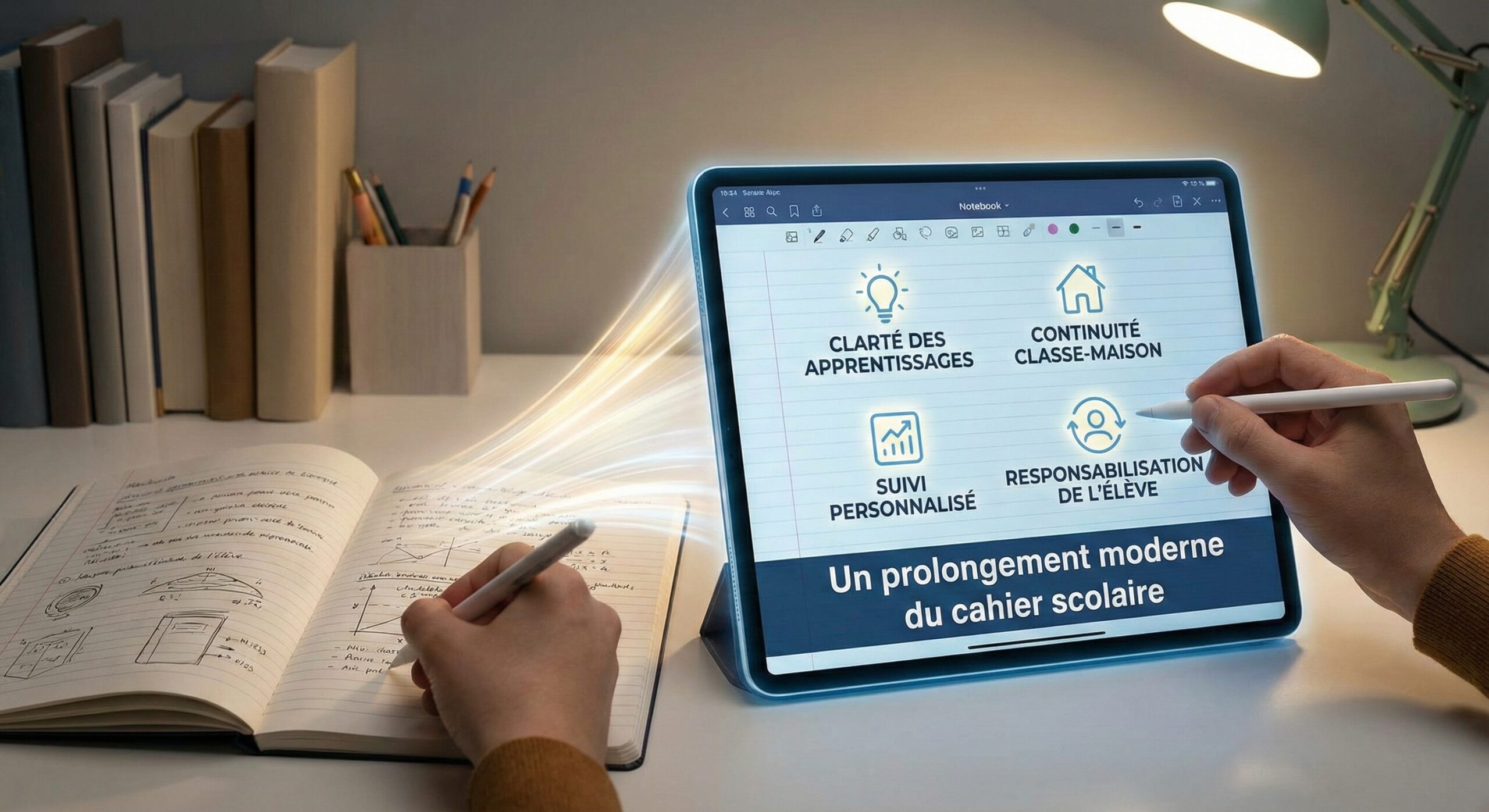 Le cahier numérique est utilisé comme un outil pédagogique complémentaire. Il permet de centraliser certains contenus, travaux et productions des élèves, tout en conservant une approche structurée et encadrée.